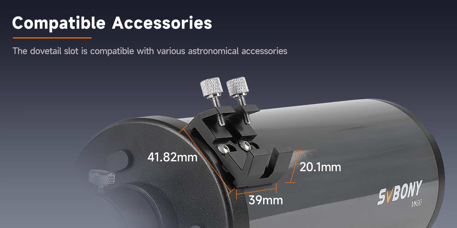 SVBONY MK90 Maksutov-Cassegrain Telescope is a compact and portable OTA, precision-calibrated through three processes before leaving the factory to ensure immediate readiness for use. Featuring a Vixen-style dovetail design, it offers ease of installation. Additionally, it utilizes a tapered baffle tube to minimize stray light, enhancing your viewing experience. It is designed for both amateur astronomers and nature lovers seeking high-quality, detailed observations.