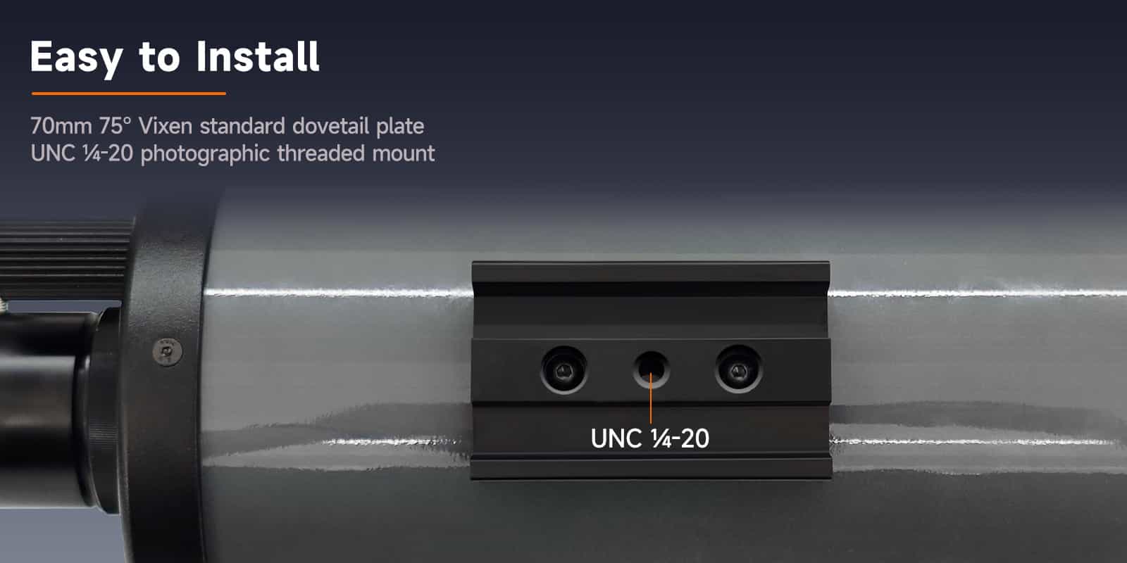 The UNC ¼-20 standard photographic threaded mount; 70mm 75° Vixen standard dovetail plate; easily mounting astronomical Mak telescope OTA with other equipment such as tripod or mount.