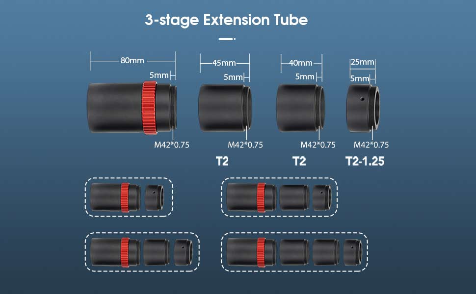 - Compatible with guide cameras; the 1.25-inch and M42 threaded interface is compatible with SV305 Pro and Orion ZWO QHY and so on auto guiding cameras; guidescope with two T2 extension tubes can assist focusing