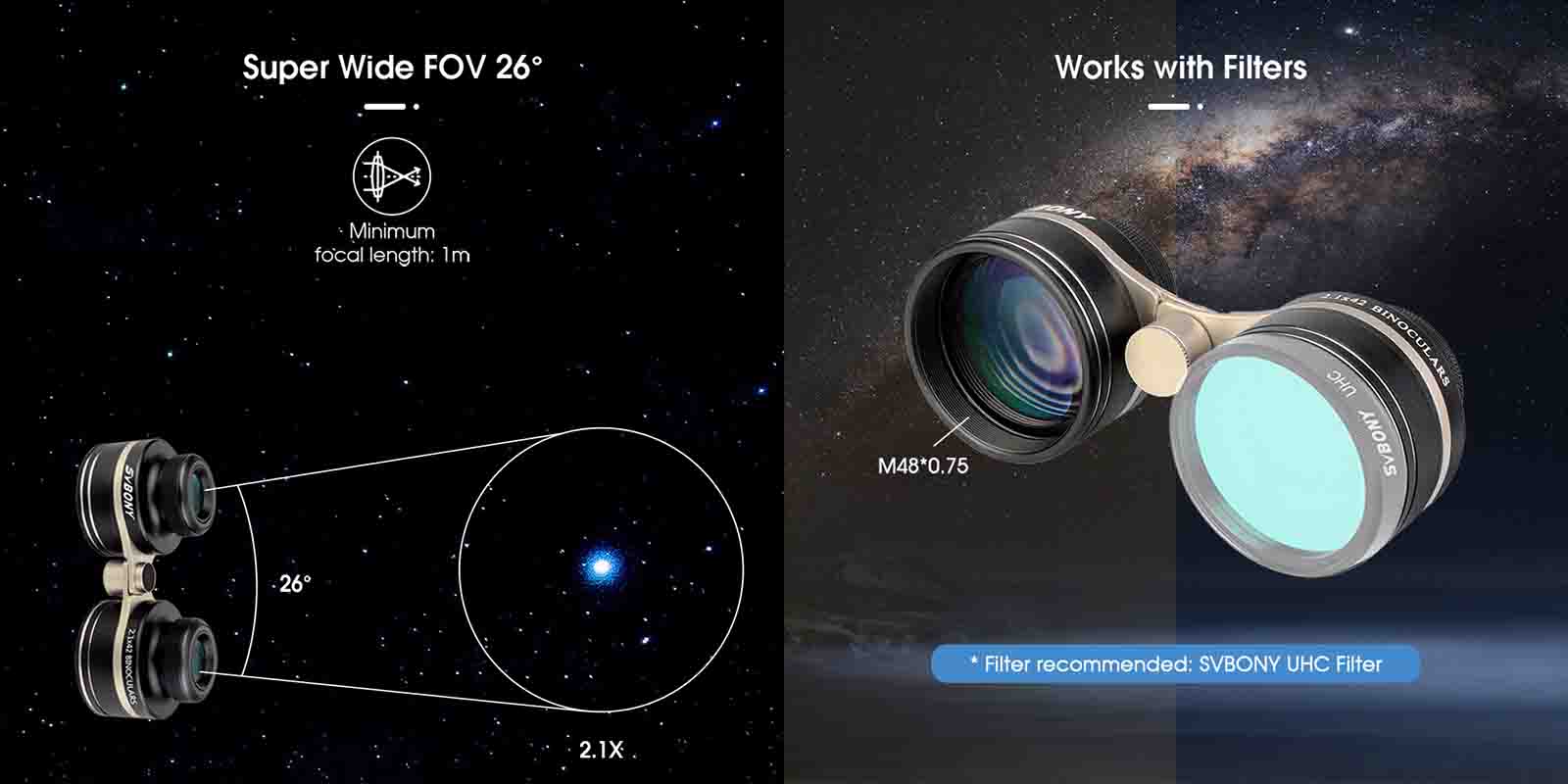 It says it takes 2” filters, but there is no guidance on which filters (in a pair) work best. It would help if Svbony recommended which filters work best with these unique binoculars. I am hesitant to purchase filters as an experiment.